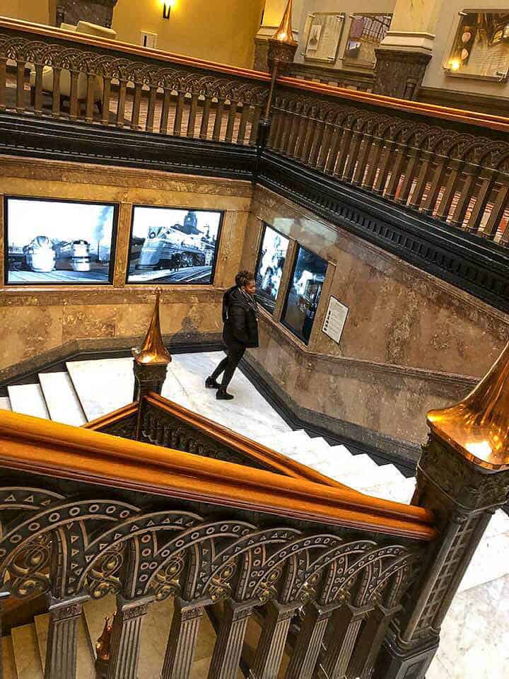 Because we were so fascinated with the architecture in our hotel, we decided to stop and peek at another hotel in a historic building. The Hilton Garden Inn is housed in the 1846 built Loyalty building, and the staircase, details, and skylight are stunning!